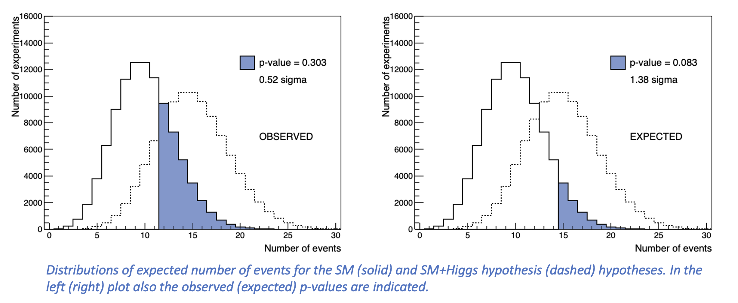 The smaller the p-value, the smaller the compatibility with the hypothesis under consideration and if the p-value drops below a pre-defined threshold we say that the numer of observed events is no longer compatible with the SM hypothesis and we can reject it: a discovery! We will say a bit more about it later as a similar procedure, with much less strict requirements, is used to reject alternative hypotheses: in our case the presence of a HIggs boson in the data.